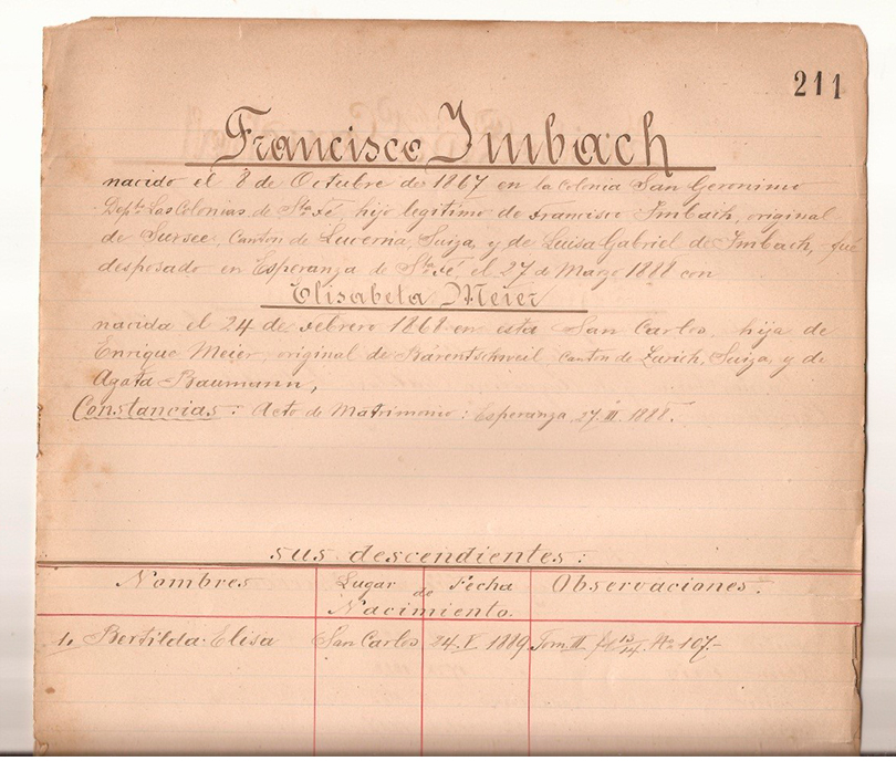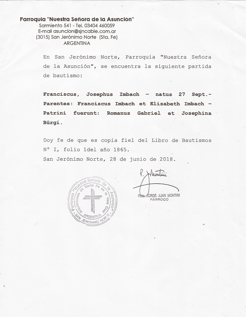Certificado de Bautismo Francisco Imbach, otorgado en San Jerónimo Norte. Persiste el “Error” del año de Nacimiento que está confirmado es en 1867.