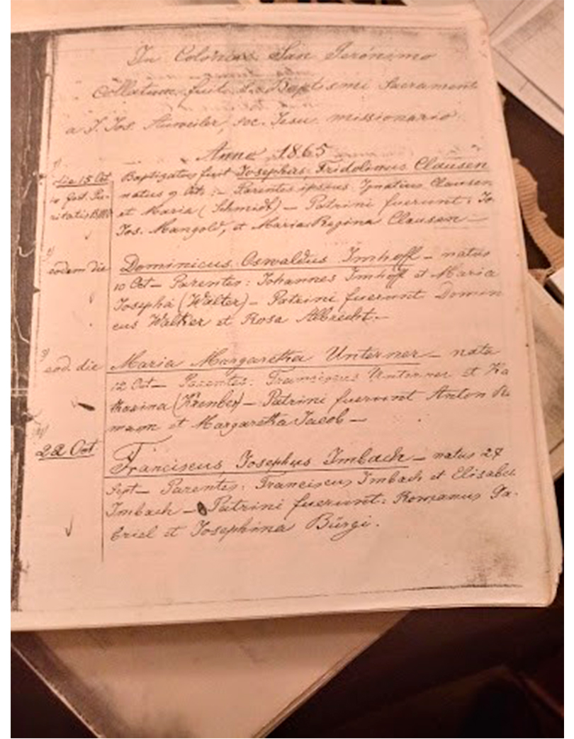 Cuaderno de Bautismo de la Iglesia Católica de Colonia San Gerónimo (hoy San Jerónimo Norte), que se inicia en 1865.