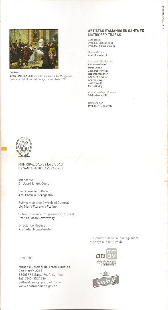 El 19 de marzo de 2015, en el marco de la muestra “Artistas italianos en Santa Fe. Matrices y trazas” en el Museo Municipal de Artes Visuales “Sor Josefa Díaz y Clucellas” e inscripta en la investigación de la profesora Adriana Crolla y su equipo en el proyecto “Altrocché!”, que recibió el Premio Convocatoria 2012 de “Espacio Santafesino” del Ministerio de Innovación y Cultura de la Provincia de Santa Fe y su Museo Virtual, disertaron las licenciadas en Artes Visuales María Teresa Serralunga y Lidia Ferré de Peña sobre la obra de los artistas Juan Cingolani y Francisco Marinaro, considerándolos como parte de la conformación de la ciudad de Santa Fe en la primera parte del siglo XX. La primera centró su disertación en una síntesis de su investigación sobre la pintura de Cingolani denominada “El Sudor Milagroso”, realizando un exhaustivo análisis de los valores testimoniales, pictóricos e históricos de la obra y en detalles sobre su gestación. Analizando además su inserción dentro del campo de la pintura de raigambre académica, contando para todo ello con la obra in situ facilitada para la muestra por el Colegio de la Inmaculada Concepción. La segunda se refirió a los elementos que a su criterio identifican la obra extensa y polifacética de Marinaro, también de formación académica, destacada en gran parte por su carácter decorativo y su inclusión en numerosas obras arquitectónicas, señalando numerosas pérdidas debidas a ese razón y basándose en una serie de imágenes proyectadas en las que mostró diversas obras y detalles de las mismas que señalaran esas particularidades.