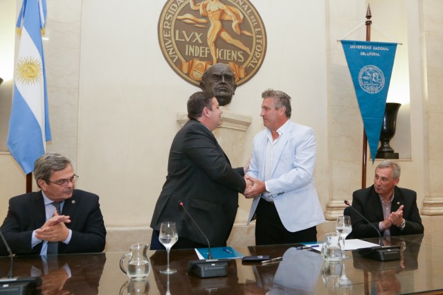 “Este edificio fue concebido para una universidad reformista, una universidad democrática y justamente hoy, al cumplirse 35 años de la recuperación de la Democracia argentina, nos llena de orgullo dar este paso del trabajo de puesta en valor de este patrimonio de los santafesinos, del sistema educativo nacional y de todos los argentinos”, aseguró el rector de la UNL, Enrique Mammarella, luego de rubricar el contrato con el titular de la empresa adjudicataria, COEMYC SA, Julio Allaio.