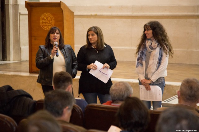 Las tres decanas de la UNL, Larisa Carrera de la FCM; Adriana Ortilani de la FBCB, y Laura Tarabella de la FHUC, fueron las encargadas de presentar la actividad tal como vienen impulsando las políticas de género y la prevención de violencias, en diálogo con todos los claustros, hasta llegar a la sanción del Protocolo contra la violencia de género.
