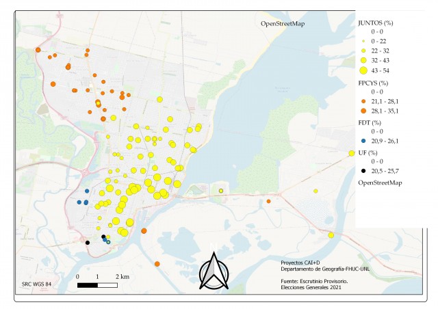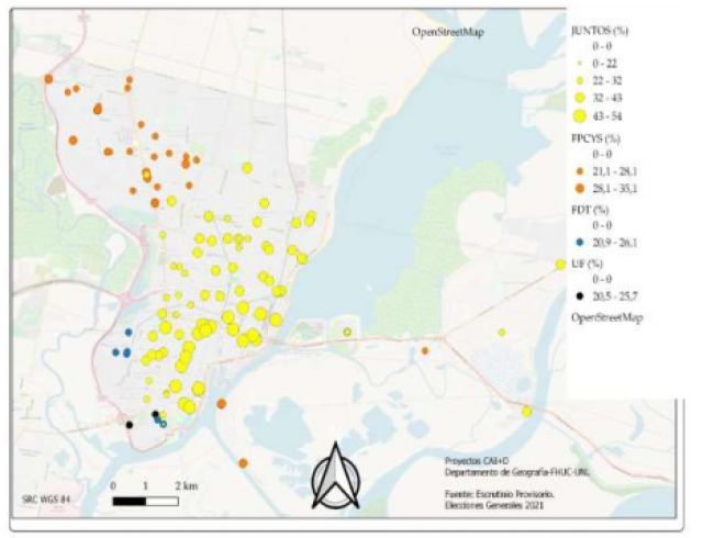 En la introducción del informe señalan que “la ciudad de Santa Fe se configura como un espacio fragmentado y heterogéneo. Estas características tienen su correlato con determinados comportamientos, como es el caso del electoral con manifestaciones dispares en cuanto a las preferencias. Las elecciones Primarias, Abiertas y Obligatorias (PASO) realizadas en setiembre pasado propinaron un triunfo al espacio “Juntos por el Cambio”, con una clara implantación territorial en las secciones electorales con condiciones de calidad de vida más favorable. Este comportamiento fue ratificado en las elecciones generales con modificaciones en las adhesiones del resto del abanico político, siendo las más notorias: