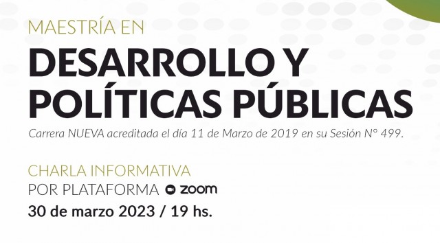 Previo al inicio del cursado de la nueva cohorte de la Maestría en Desarrollo y Políticas Públicas, se realizará una nueva charla virtual informativa el jueves 30 de marzo, a las 19:00, a través de la plataforma Zoom. Se abordarán los aspectos académicos y organizativos centrales de la carrera. También se contará con la presencia de alumnos avanzados que comentarán su experiencia.