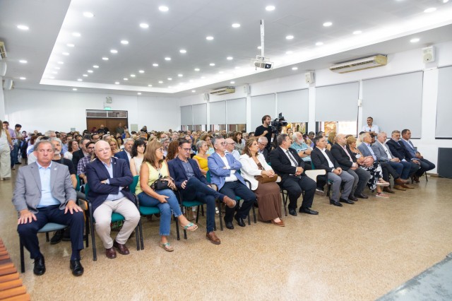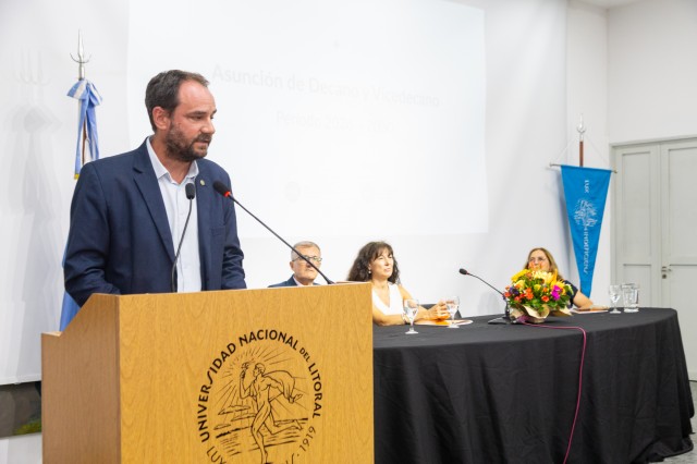 El acto se desarrolló en el Salón de Actos de la institución y contó con la presencia, entre otros y otras, del rector de la UNL, Enrique Mammarella, la decana saliente de FHUC (y rectora electa), Laura Tarabella, autoridades del Rectorado y de distintas unidades académicas de la Universidad.