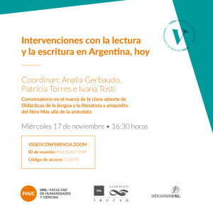 Para ver esta clase a cargo de Mónica Bernabé, Martina López Casanova, Paula Caldo, Larisa Cumin, Sandra Ferreyra, Carolina Zunino, Sergio Frugoni, Laura Rafaela García, Carla María Indri, Carola Hermida, Mila Cañón, Istvansch, Facundo Nieto, Claudia Santiago, Beatriz Vottero y los.as.es estudiantes de Didácticas de la lengua y de la literatura (FHUC-UNL), hacer click aquí: https://www.youtube.com/watch?v=0WFkYDKKWHs